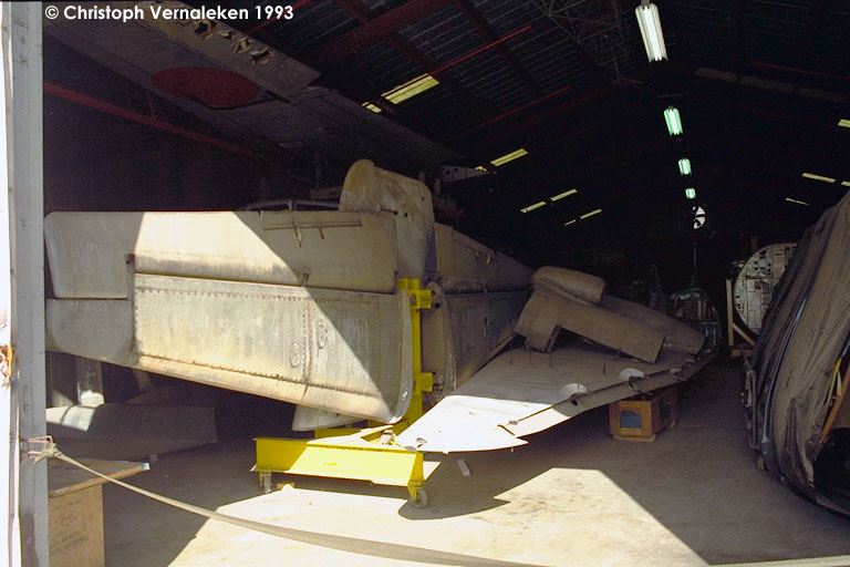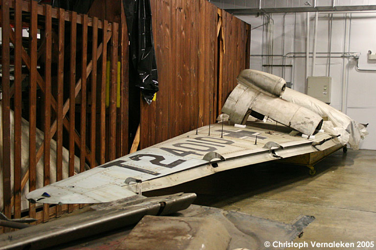 Das folgende, Ende März 2005 aufgenommene Foto zeigt die rechte Tragfläche nochmals etwas deutlicher, die US-Kennung T2-4010, mit der die Maschine in den USA geflogen wurde, ist sehr gut zu erkennen, ebenso die Antenne für das FuG 217. Um Beschädigungen vorzubeugen, ruht die Triebwerksverkleidung jetzt auf kleinen Schaumstoffpolstern.